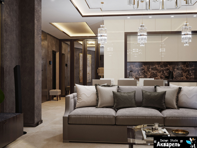 Заказчики поставили задачу создать современный интерьер с контрастным сочетанием цветов, дизайнеры предложили добавить легкие ноты стиля ар -деко. |