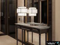 В оформлении интерьера ставка была сделана на натуральные материалы и цвета законов стиля ар-деко с насыщенной фактурой.