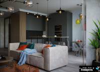 Интерьер квартиры выполнен в сдержанных тонах в стиле лофт. В качестве акцентных элементов дизайнерами использован текстиль-подушки на диване, а также оригинальная картина абстрактной тематики в стиле лофт.
